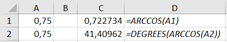 - =DEGREES(ARCCOS(A2))