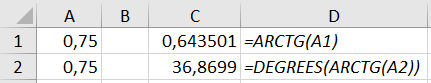 - =DEGREES(ARCTG(A2))