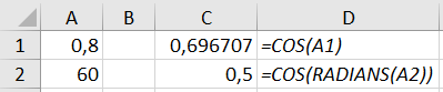 - =COS(RADIANS(A2))