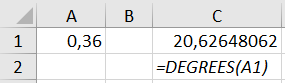 - =DEGREES(A1)
