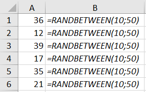 - =RANDBETWEEN(10;50)