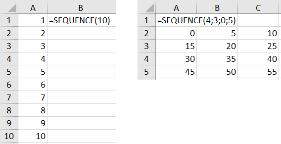 - =SEQUENCE(řádky;sloupce;začátek;krok)