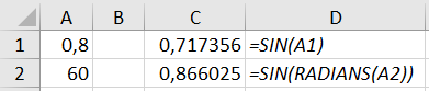 - =SIN(RADIANS(A2))