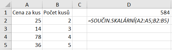 - =SOUČIN.SKALÁRNÍ(A2:A5;B2:B5)