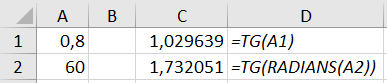 - =TG(RADIANS(A2))